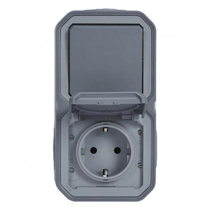 NOWE PLEXO 55 Gniazdo Schuko 2P+Z + łącznik schodowy komplet natynkowy 16A - 250V AC szare 069746L