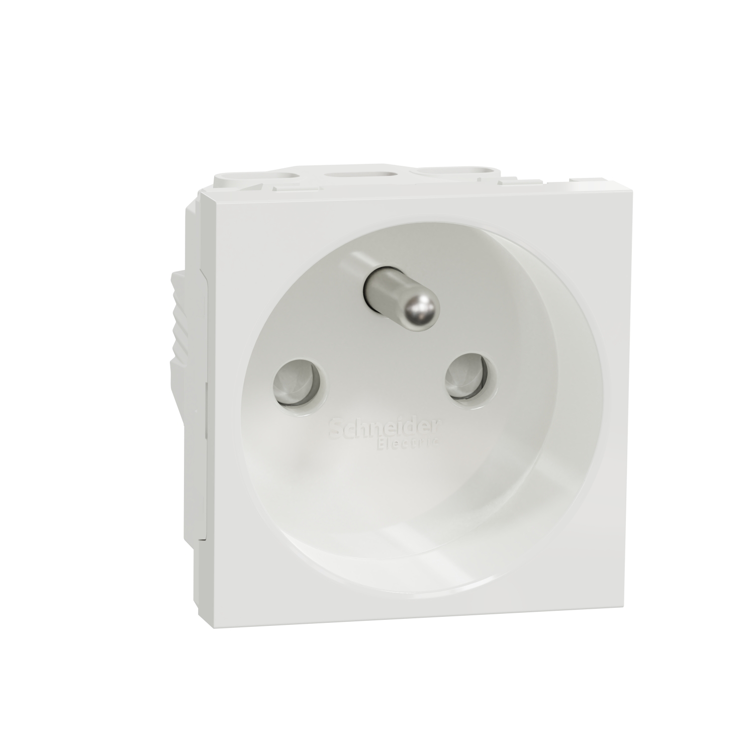 Gniazdo gniazdowe firmy Schneider Electric o konfiguracji 2-biegunowej o napięciu znamionowym 16 A. Błyszczące i niepoddane obróbce białe wykończenie.