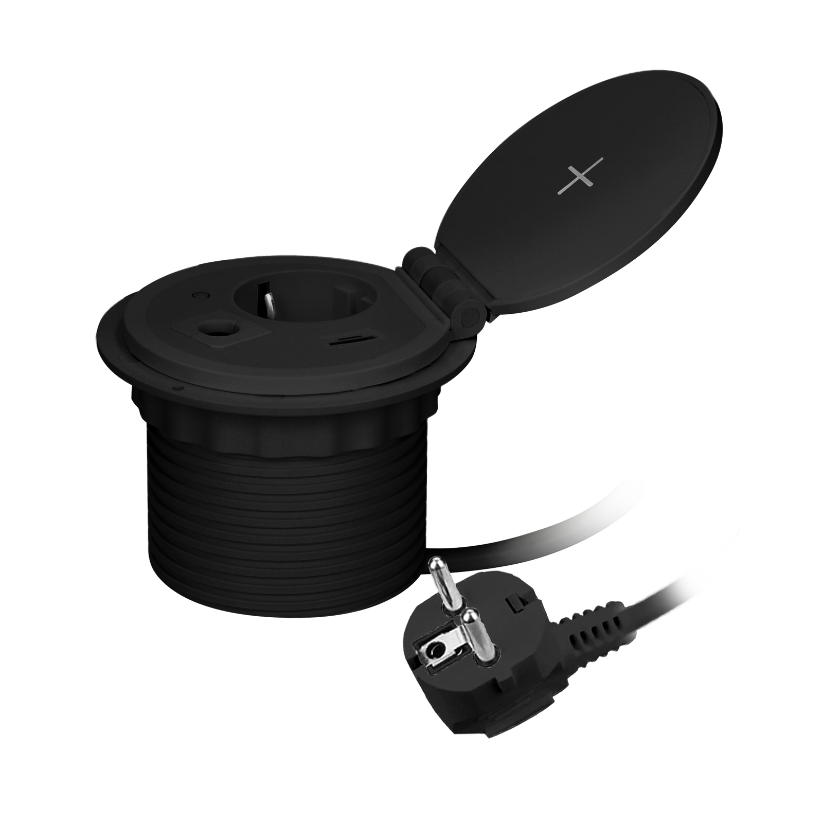 Gniazdo meblowe Ø8cm wpuszczane w blat z ładowarką indukcyjną, ładowarką USB z 2 gniazdami A i C, przelotką kablową z przewodem 1,8m, 1x2P+Z (Schuko), 2xUSB 2,4A 5V, czarneKompaktowe gniazdo meblowe wpuszczane w blat, które można zastosować w każdym biurku. Posiada 1 gniazdo elektryczne 1x2P+Z (Schuko), ładowarkę indukcyjną, szybką ładowarkę USB z dwoma gniazdami A i C oraz dodatkowy moduł wymienny, który w prosty sposób możesz zastąpić innym modułem funkcyjnym (akcesoria dodatkowe), dzięki którym w jednym miejscu podłączysz sprzęt różnego typu. Wyposażone w przelotkę kablową i 1,8m kabel. Kolor czarny. Informacje ogólne