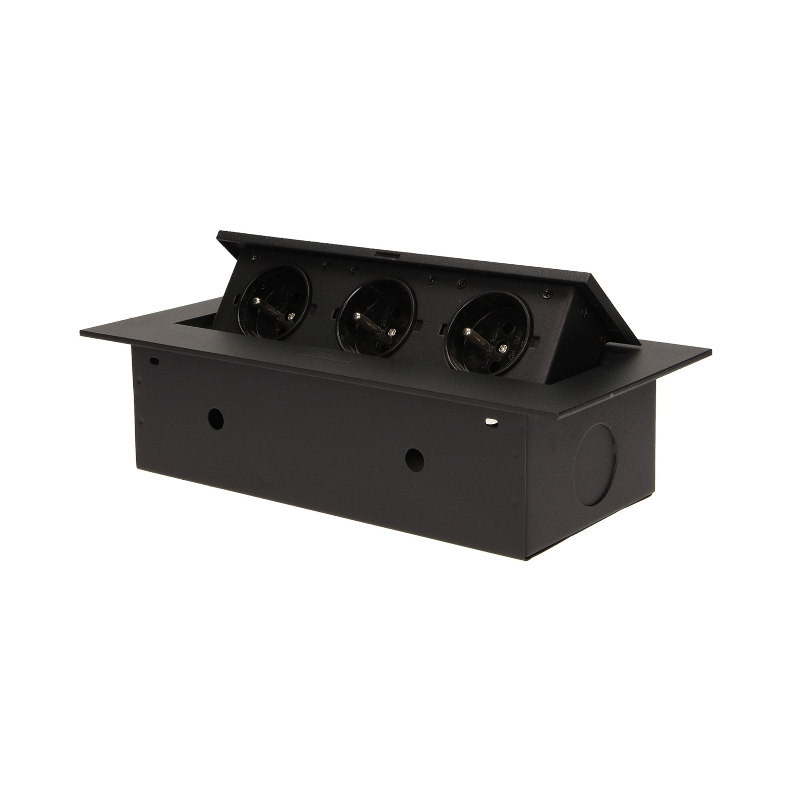 Gniazdo meblowe wpuszczane w blat z płaskim rantem, 3x2P+Z, czarneZestaw trzech gniazd sieciowych z uziemieniem i przesłonami torów prądowych w obudowie chowanej w blat. Urządzenie przeznaczone jest do montażu w biurkach, blatach i stołach, może być zamontowane zarówno w pozycji pionowej jak i poziomej, zapewniając dostęp do gniazd elektrycznych. Zalecany przewód OWY 3 × 1,5mm² (brak w zestawie). Dostępne kolory: czarny, srebrny. Informacje ogólne