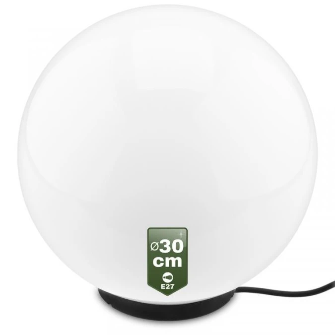 Nowoczesny design i atrakcyjny wygląd Średnica kuli 30 cm Wymienne źródło światła - gwint na żarówki E27 Wysoka energooszczędność dzięki możliwości zastosowania żarówki LED Lampa z przewodem zasilającym o długości 138.5 cm - umożliwiającym bezpośrednie podłączenie do gniazdka 230V Klosz z bardzo wytrzymałego na uszkodzenia mechaniczne i przebarwienia szkła hartowanego Lampa z aluminiowym szpikulcem umożliwiającym wbicie w podłoże Podstawa wykonana z metalu, klosz ze szkła hartowanego Wysoka odporność na warunki atmosferyczne IP65