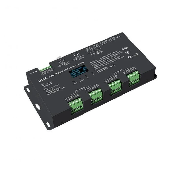 Sterownik LED DMX512 - Dekoder/Master DMX to osprzęt w formie sterownika LED posiadający dwanaście wbudowanych kanałów dla których możemy określić indywidualne cyfrowe adresy i uzyskać dostęp do sterowania oświetleniem LED (np. RGB czy CCT). Sterownik DMX512 D12A umożliwia zmianę trybu ściemniania w całym zakresie gammy 0.1 – 9.9. Natomiast dla czołowych instalacji opartych o oświetlenie LED, przygotowane zostały dwa gotowe tryby – liniowy oraz logarytmiczny. Sterowanie w przypadku dekoderów opartych o system DMX definiuje się jako zmiana jasności, koloru RGB czy temperatury barwowej CCT, bowiem każde wyjście może otrzymać przypisaną cechę do którego dostęp będzie realizowany wykorzystując jego uprzednio ustalony adres. Ponadto istnieje możliwość ustalenia częstotliwości PWM przez co w bezpośredni sposób możemy zmienić charakterystykę wykonywania pracy w zależności od potrzeby. Urządzenie sterujące D12A wyposażone w wiele zabezpieczeń, takich jak - zabezpieczenie zwarciowe, przeciążeniowe, termiczne czy odwróconej polaryzacji.