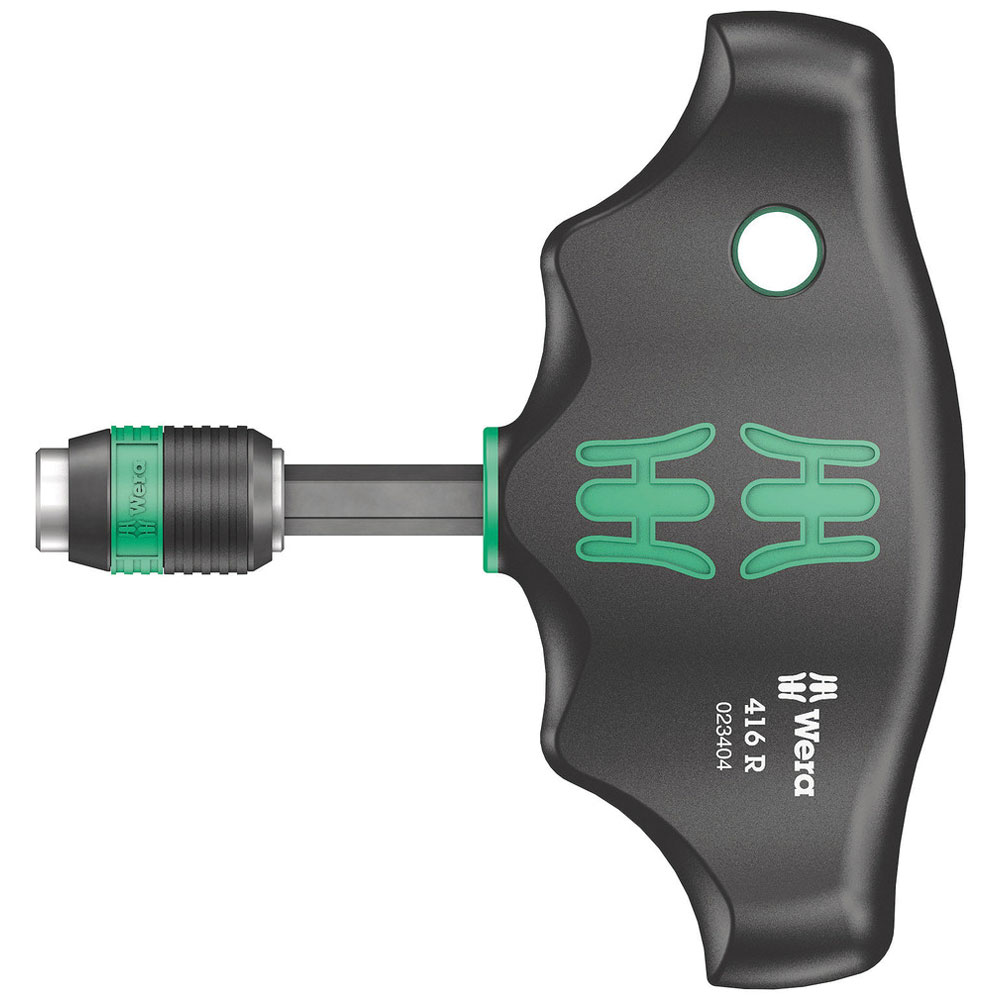 Wera 05023404001 416 R T-handle bitholding Screwdriver Rapidaptor, 1/4" x 45mm - The ideal handle shape to allow high torque transmission in difficult tightening and loosening situations. The ergonomic shape of the handle fills the palm of the hand well, the fingers lie safely in the soft rounded handle recesses.