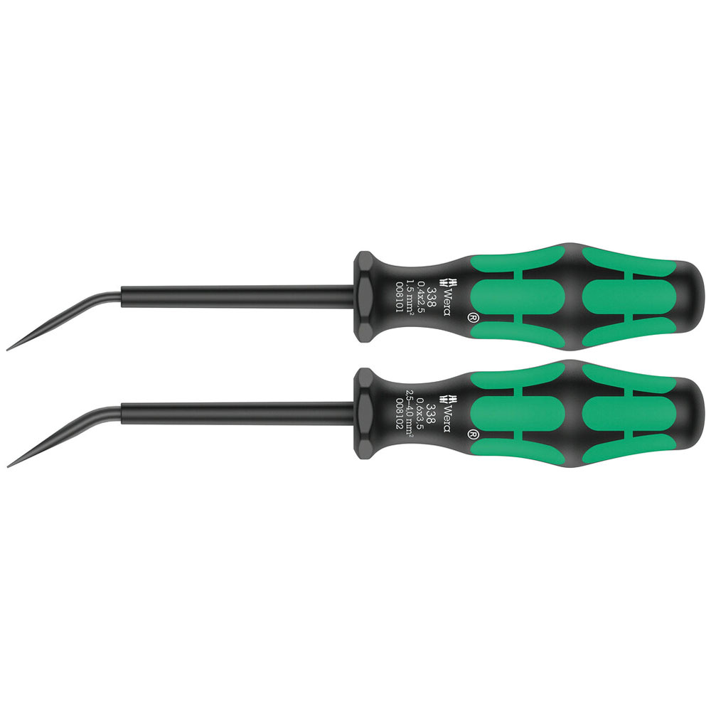 Wera 05008100001 338/2 Set of Actuation Tools For Terminal Blocks 2 pc - Set with 2 actuation tools for spring terminals. The curved blades also make it easy to operate spring terminals in distribution boxes which cannot be reached with a straight blade. The blade stays in the terminal block, leaving both hands free to insert the wire. Multi-component Kraftform handle for fast and smooth work.