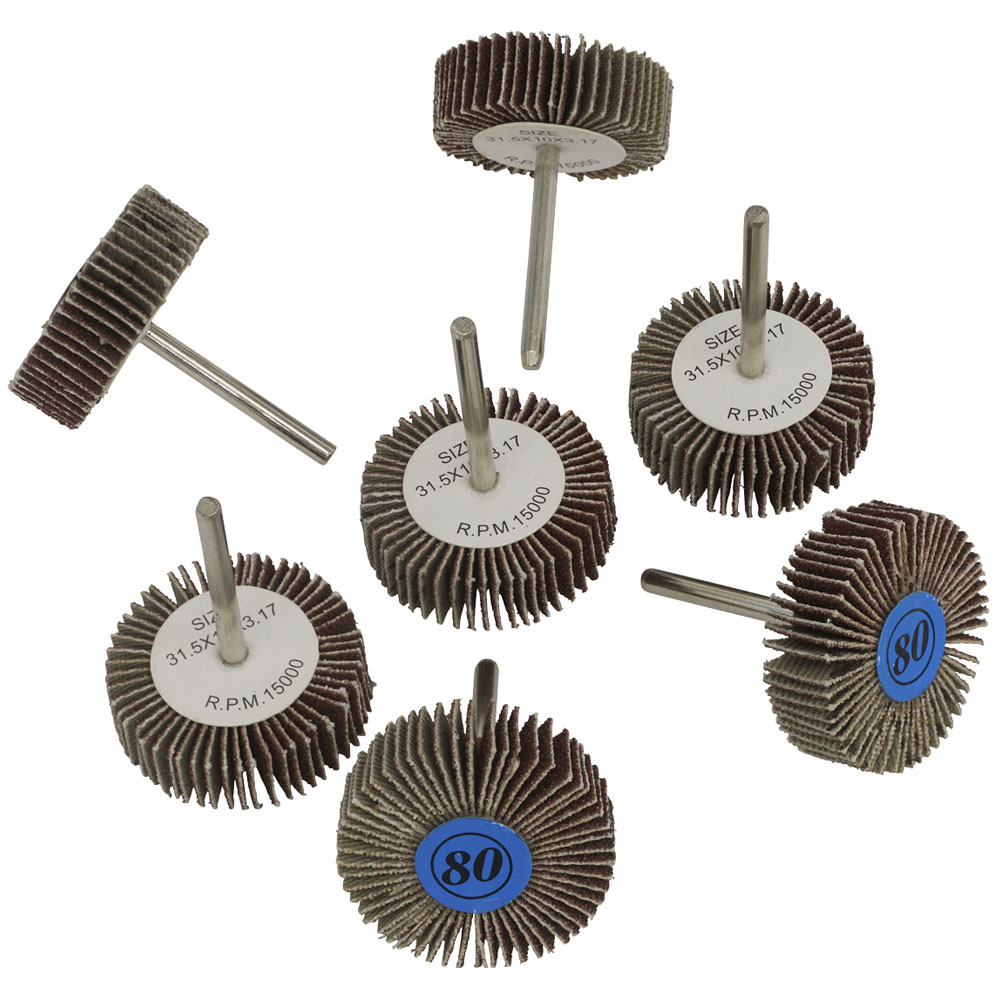 Ideal for surface treatment, smoothing corners and deburring in small, confined areas. Set includes 60Grit (x4) and 80Grit (x3) flap wheels. Compatible for use with Sealey and most popular brands of drills and die grinders.