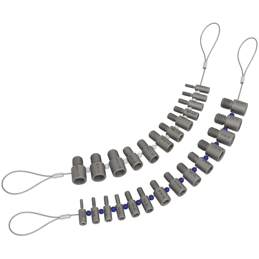 26-Piece thread checker. Easily identify nut and bolt sizes in imperial UNC and UNF (14 piece) or metric (12 piece). Thread checkers on a wire lanyard for quick and precise measuring. White beads between the gauges to indicate the metric sizes and blue to indicate imperial. Convenient loops on each end for hanging.