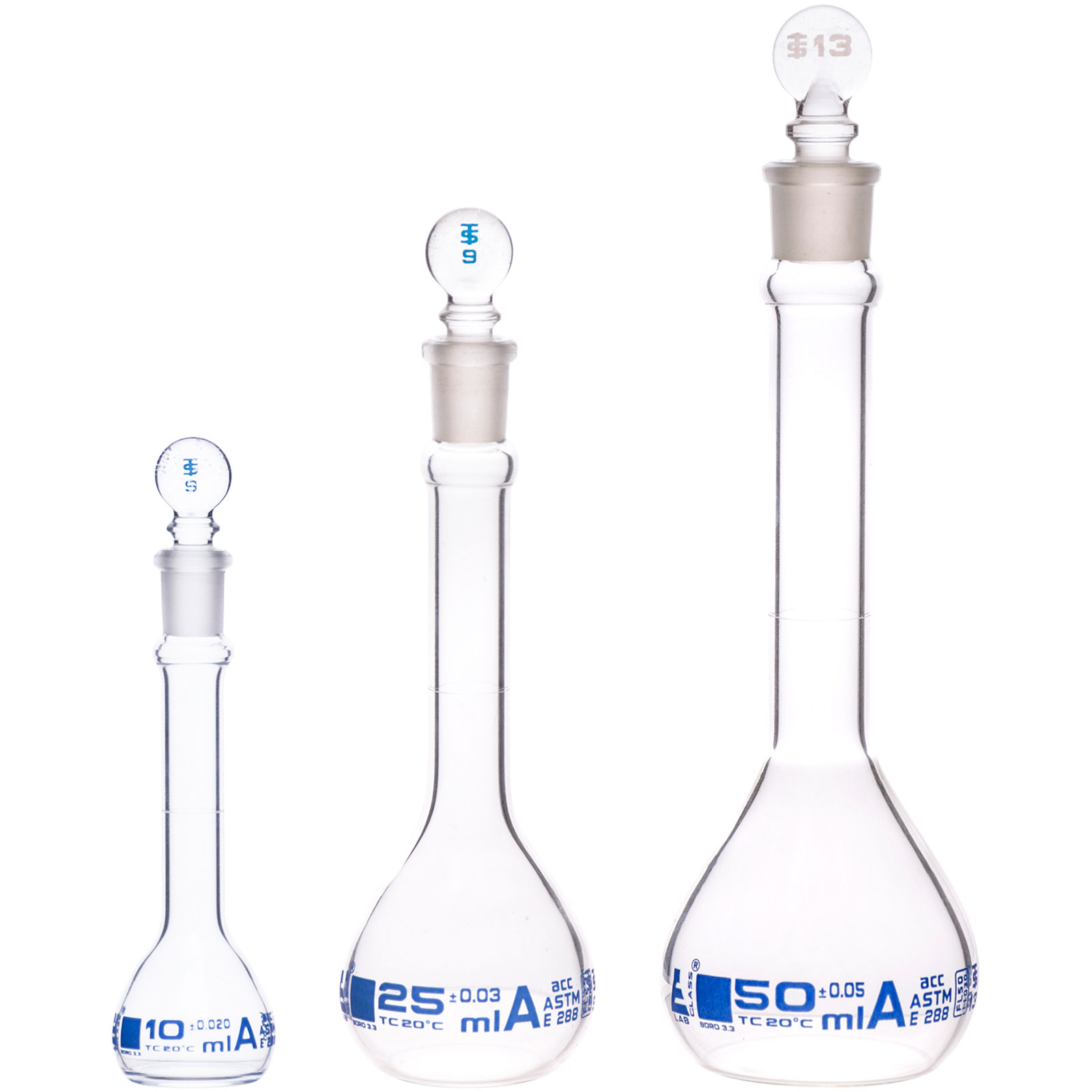 EISCO CH196041 Premium Volumetric Flask Set, Class A Borosilicate 3.3 Glass Is a three piece Volumetric Flask set made of high quality Borosilicate 3.3 Glass. It includes three flasks with 10ml, 25ml & 50ml capacities. Class A Tolerance, as per ASTM E288 standards. Each flask includes a glass penny stopper and features a single white graduation line. Set is packaged in a custom fit, thick foam casing, for safe storage and worry free transport.