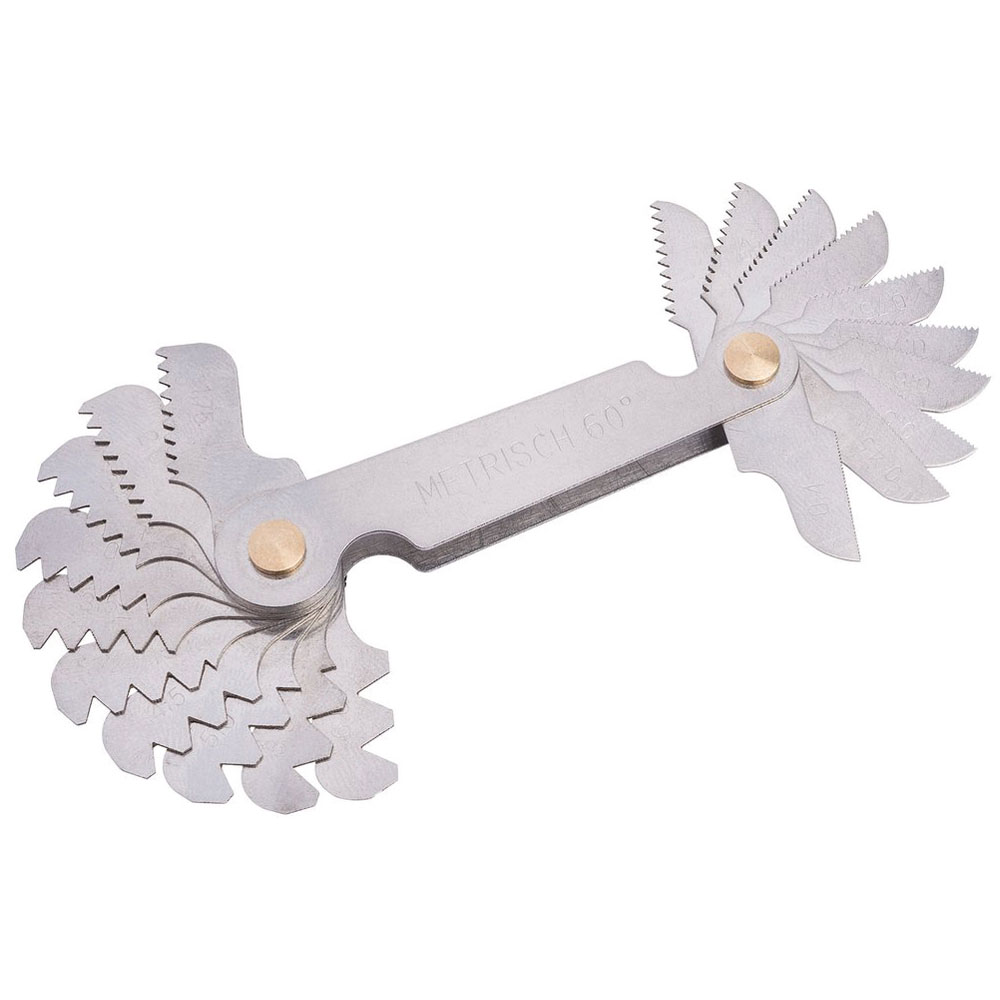 Folding leaves, individually stamped with accurately formed thread profiles. 20 blades ranging from 0.4, 0.45, 0.5, 0.6, 0.7, 0.75, 0.8, 1.0, 1.25, 1.5, 1.75, 2.0, 2.5, 3.0, 3.5, 4.0, 4.5, 5.0, 5.5, 6.0mm. Sold loose.
