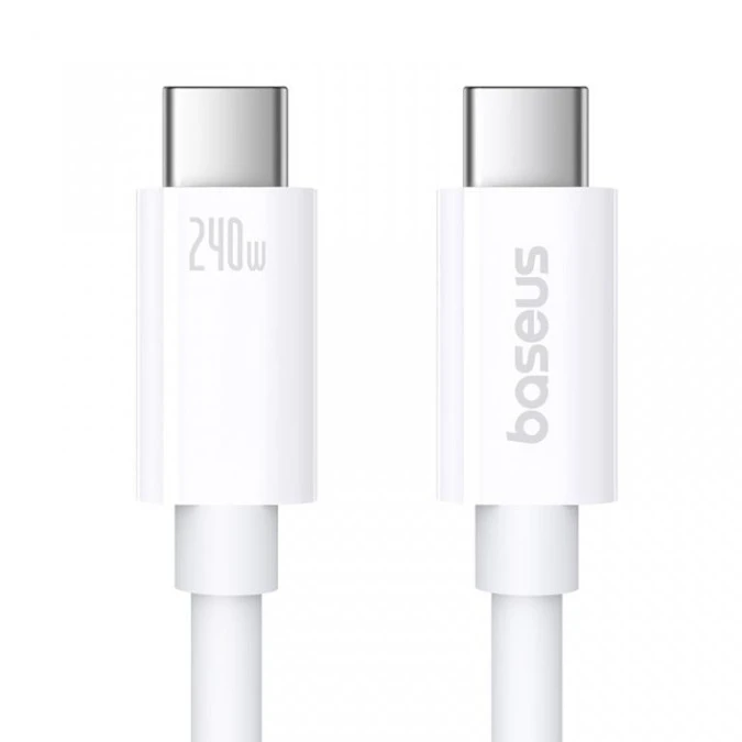 Kabel Baseus CB000066 PD 8K 60Hz ze złączem USB-C, o mocy 240W i długości 1m - biały Kabel Baseus CB000066 posiada dwa złącza USB-C i pracuje z mocą do 240 W. Współpracuje z protokołem szybkiego ładowania Power Delivery 3.1. Umożliwia przesyłanie filmów o rozdzielczości do 8K 60Hz. Oprócz szybkiego ładowania zapewnia również błyskawiczny transfer danych - osiąga prędkość do 40 Gb/s!