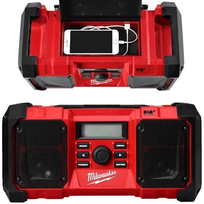 Wysokiej jakości system audio - tuner DAB+/FM, z cyfrowym procesorem, zapewnia najwyższą jakość odbioru i czystość sygnału DAB+ zapewnia najlepszą jakość dźwięku i dodatkowe informacje takie jak: tytuł utworu, wykonawcę / zespół, występ, dokładny czas Podwójny głośnik z pasywnymi radiatorami dostarcza głośny, czysty dźwięk z głębokim, dokładnym basem Regulowany wzmacniacz zapewnia wyższą jakość dźwięku i programowanie 10 stacji Zaślepki absorbujące wstrząsy i metalowe siatki głośnika chronią w razie upadków, kontaktu z wodą i odpadami na stanowisku pracy Wbudowane uchwyty pozwalają na łatwe przenoszenie i przechowywanie Zasilanie bateriami MILWAUKEE® M18™ albo poprzez wyjście prądu przemiennego (AC). Czas pracy do 12 godz. z akumulatorem M18™ REDLITHIUM™ 5.0 Ah Wodoszczelna komora urządzenia chroni urządzenia przenośne Zabezpieczone wyjście USB 2.1 A służy do ładowania urządzeń w obu trybach, prądu przemiennego i prądu stałego (AC/DC) W wyposażeniu znajduje się pomocniczy przewód przyłączeniowy, 2 x baterie AAA. Baterie MILWAUKEE® sprzedawane są osobno.