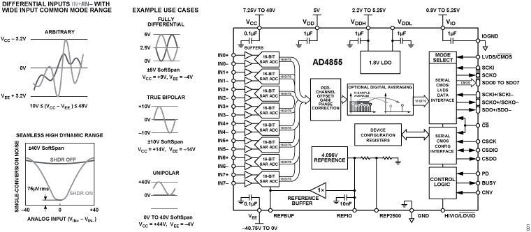 The AD4855 is a fully buffered, 8-channel simultaneous sampling, 16-bit, 250 kSPS data acquisition system (DAS) with differential, wide common-mode range inputs. Its functional architecture is shown in Figure 1. Operating from a 5 V low voltage supply, flexible input buffer supplies, and using the precision low drift internal reference and reference buffer, the AD4855 allows the SoftSpan range of each channel to be independently configured to match the native application signal swing, minimizing additional external signal conditioning. To further maximize single-conversion dynamic range, the AD4855 incorporates seamless high dynamic range (SHDR) technology. When enabled, the input signal path gain of the channel is automatically optimized on a sample-by-sample basis, minimizing converter noise on each sample without impacting linearity.