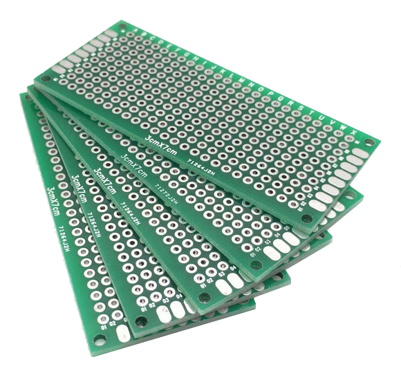 A set of 5 handy experimental prints of 3x7cm that are etched on both sides. Because the prints can connect on both sides, it is very easy to make connections. The prints have 24 x 10 holes with 8 pads on both sides (not connected). The thickness of the PCB is 1.2mm.