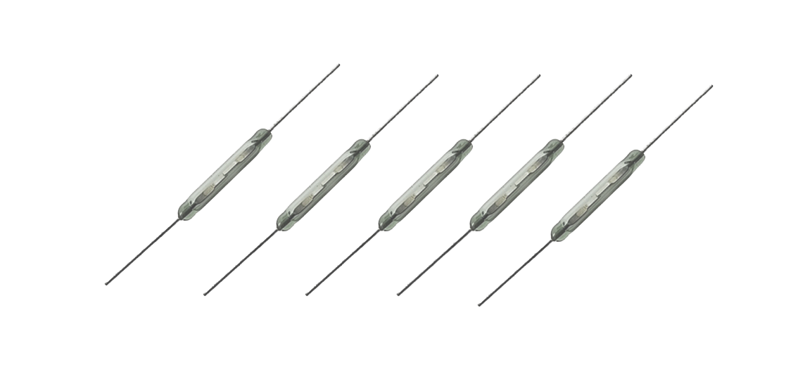 A set of 5 glass, normally open reed switches. This Reed switch, also called a Reed contact, is an open switch when it is not running. When a magnetic source comes close, the contacts will bend towards each other and the reed switch will allow current to pass through.