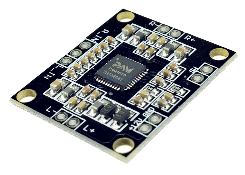 This amplifier based on the PAM8610 is very powerful, which makes this module with its small size a good choice to add audio to a project. This class D amplifier can deliver 2 x 15W of power to 2 speakers. The module can be powered with a voltage between 7V and 15V and has an efficiency of up to 90%.