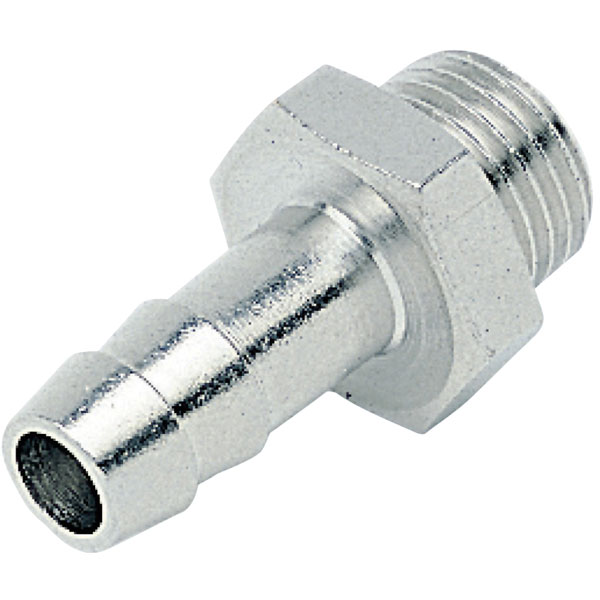 A 9mm diameter hose barb to G1/4 external thread adaptor. Manufactured from nickel plated brass and suitable for use in compressed air systems.