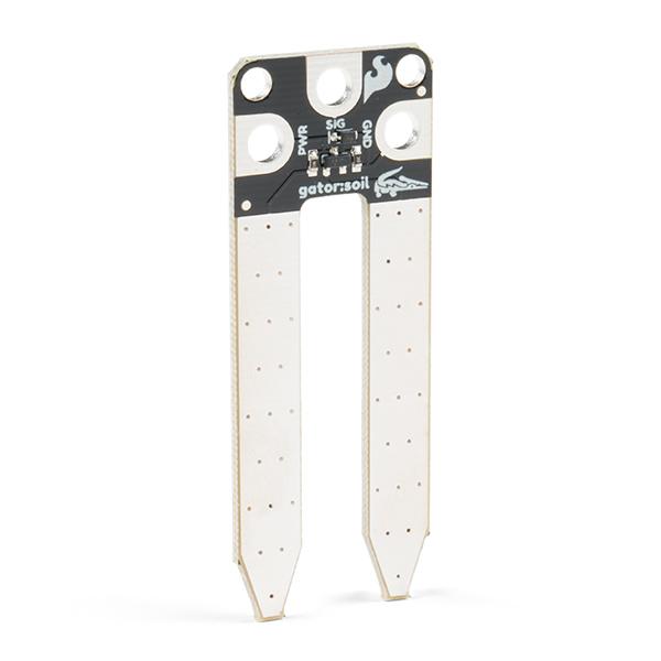 The SparkFun gator:soil - micro:bit Accessory Board is a handy device that measures soil moisture levels, providing a simple, efficient solution for those who need to monitor their plants' hydration levels. This board is part of SparkFun's gator:bit series, which is designed for easy interfacing with the micro:bit or other microcontrollers using alligator clips. The gator:soil board features two probes and three pads: PWR, GND, and SIG. The probes measure the soil's conductivity, while the SIG pad provides an analog voltage output that can be attached to an ADC pad on the gator:bit (v2). The readings on the SIG pad can vary based on soil composition, probe contact, soil compaction, and other factors, making it advisable to calibrate your sensor reading for each soil sample and sensor.It's recommended to power the gator:soil with between 3.3V - 5V. Please note that the analog value returned will vary depending on the voltage provided for the sensor. For use with the gator:bit (v2) and micro:bit, you should provide 3.3V through the PWR and GND pads. To reduce corrosion of the probes, it's recommended not to power the sensor constantly; this can be controlled through one of the digital pins of the gator:bit (v2).The micro:bit is a compact, pocket-sized computer that opens up a world of creativity with digital technology. With the micro:bit and SparkFun's shield-like bit boards, you can code, customize, and control your micro:bit from almost anywhere. This versatile board, which is half the size of a credit card, can be used for a wide range of unique creations, from robots to musical instruments and more.The SparkFun gator:soil board is gator:bit compatible and features power input, analog voltage output representing conductivity between probes, and ground reference contacts. The probes are used to sample soil moisture content for the sensor.For more information, refer to the schematic, Eagle Files, Hookup Guide, gator:soil PXT Package, micro:bit Information Page, and GitHub Hardware Repo.