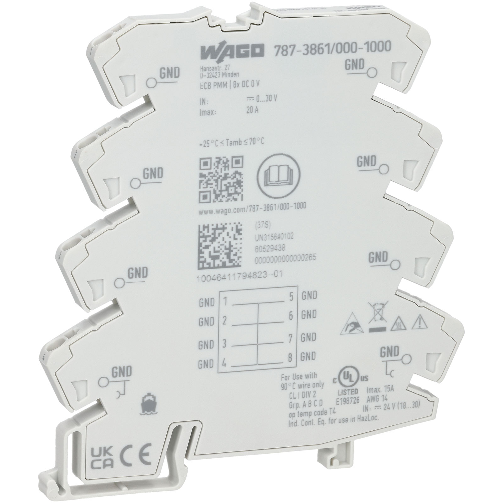 * 1 potential, with 8 clamping points 0V * Conductor cross-section: up to 2.5mm² * Operating voltage range: from 0 to 30V DC * Limiting continuous current: 20A, 15A (UL) * Ingress Protection: IP20 * Connection type: Push-in CAGE CLAMP® technology * Mounting: DIN-35 rail * Manufacturer part 787-3861/000-1000