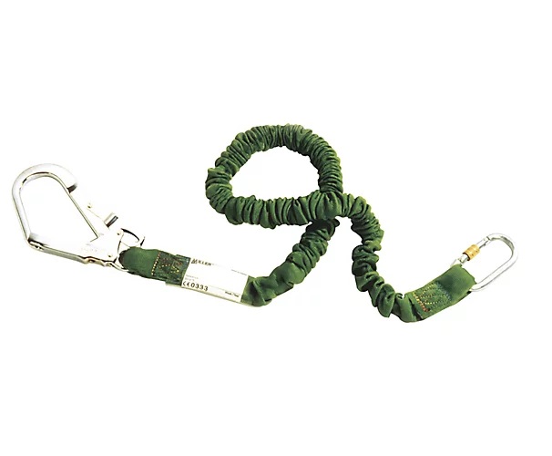 Absorbująca wstrząsy smycz Honeywell Safety Manyard ma rozciągliwą konstrukcję z karabińczykiem śrubowym i automatycznym hakiem do rusztowań.