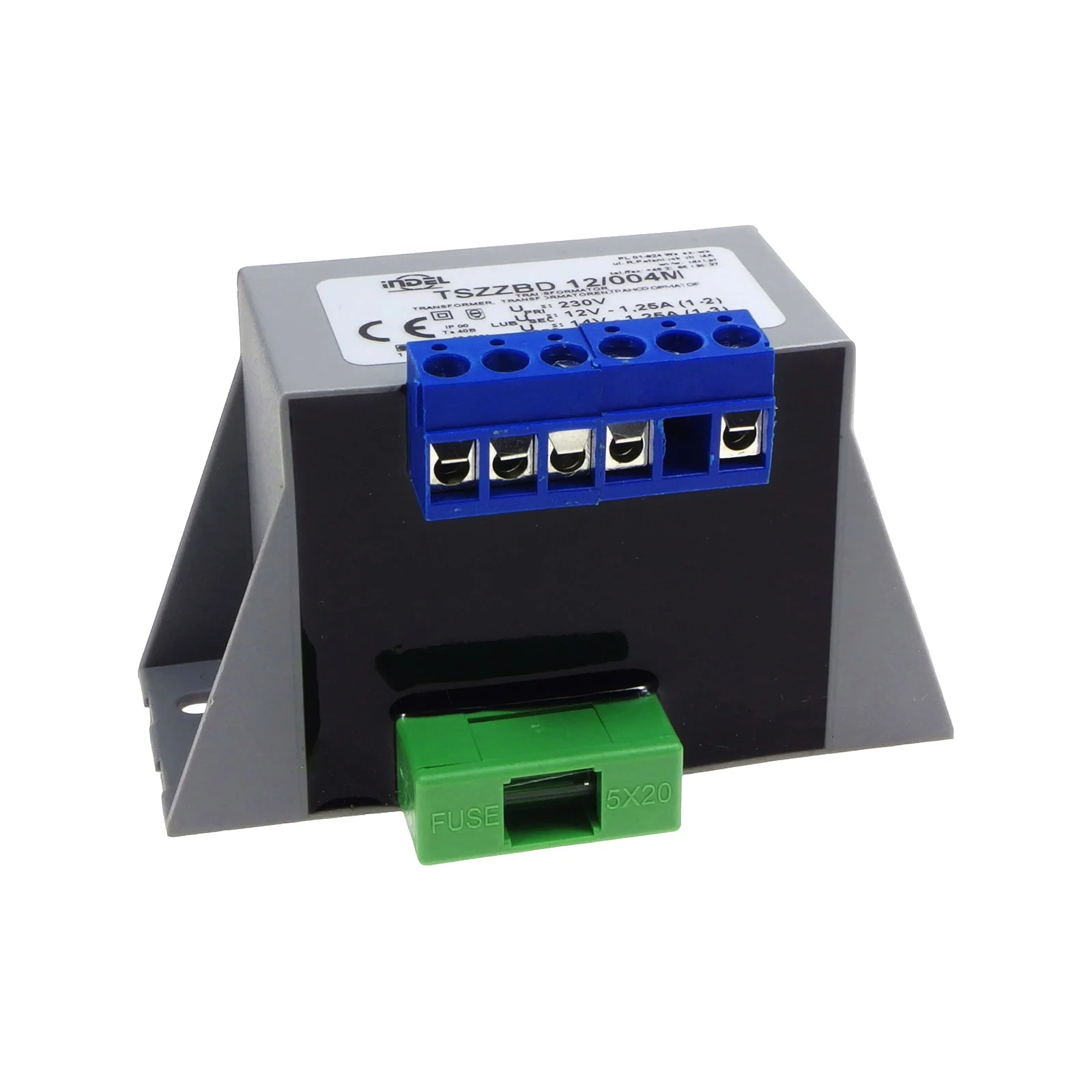 Transformator z serii TSZZBD produkowany przez firmę INDEL to zalewany żywicą transformator sieciowy, zaprojektowany głównie do zasilania systemów domofonowych. Charakteryzuje się solidną konstrukcją oraz estetyczną obudową, która zapewnia ochronę mechaniczną i odporność na wilgoć oraz inne czynniki zewnętrzne. Dzięki temu transformatory serii TSZZBD mogą być stosowane zarówno wewnątrz, jak i na zewnątrz budynków. Transformatory te są wyposażone w listwy zaciskowe ułatwiające montaż oraz posiadają wbudowane zabezpieczenia, takie jak bezpieczniki, chroniące przed przeciążeniami i zwarciami. Standardowe napięcie pierwotne wynosi 230V AC, natomiast napięcia wtórne i moce zależą od konkretnego modelu. Transformator sieciowy 12VA 230VAC [14V / 0,85A] do domofonów
