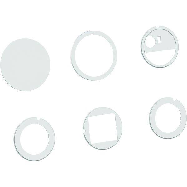 Zestaw osłon obrotowych PIX w kolorze białym, podobnym do RAL 9010, do zakrycia jednostki gniazdowej. Pokrywa z tworzywa sztucznego PIX w kolorze białym, podobnym do RAL9010, z pierścieniem dekoracyjnym, białym, podobnym do RAL9010, wraz z 4 osłonami dla wariantów krajowych i przyłączeniowych, w kolorze białym, podobnym do RAL9010 , osłona gniazda styków ochronnych i gniazda UTE, osłona gniazda UK osłona osłony modułów niestandardowych osłona gniazda T13 Switzerland pakowana w torebkę foliową