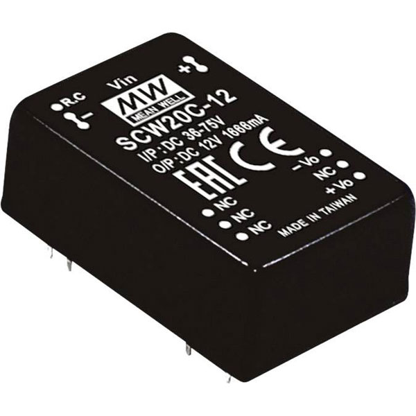 The Mean Well SCW20B-05 is a DC/DC converter module capable of delivering 4 A at 20 W, with a single output. It efficiently converts direct current to another voltage level, ideal for industrial and telecommunications applications. This module ensures reliable performance in its voltage and current rating tasks.