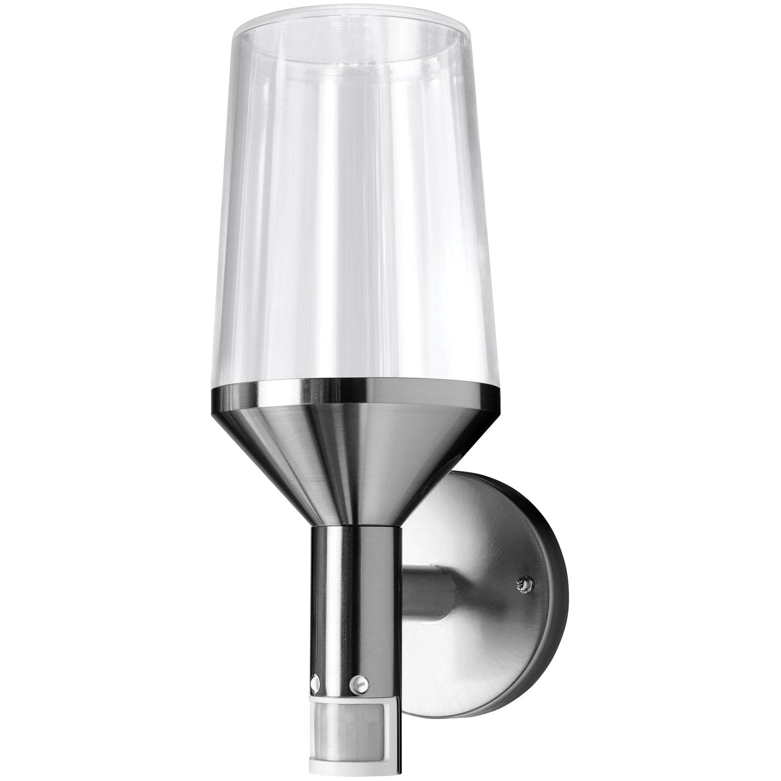 Stainless steel lamp with glass diffuser. Product features: Bright and functional LED exterior lights. Available with and without motion sensor. Housing made of stainless steel. Protection class: IP44 Product advantages: High flexibility in the choice of the bulb thanks to the E27 socket. Easy and quick installation. Application areas: Radiation of facades. Entrance lighting. Terraces, balconies. Road lighting. Approach slabs. Technical equipment: Complete mounting and connection accessories included. No bulbs included.