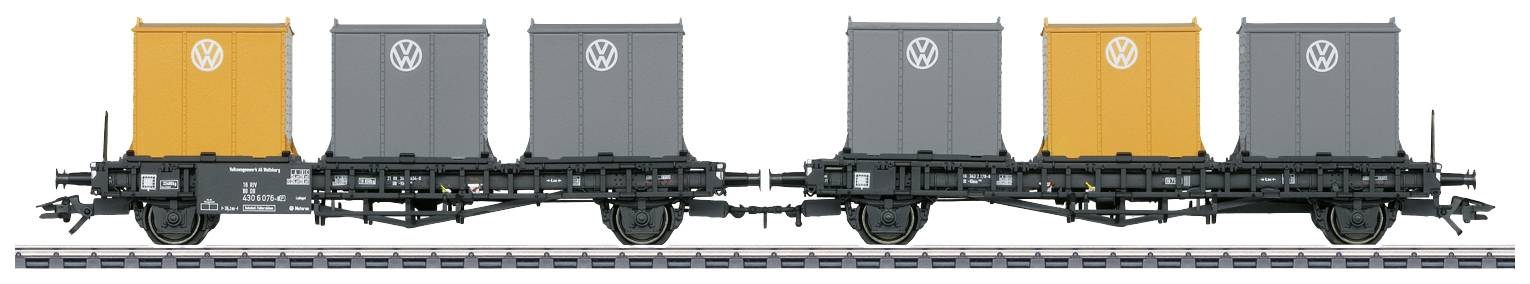 Model: Wagon do transportu kontenerów z kratownicami i różnymi numerami identyfikacyjnymi. Załadowano łącznie sześć kontenerów transportowych Volkswagena o różnych numerach kontenerów. Łączna długość z buforami ok. 28,2 cm. Zestaw przekładni prądu stałego E700580. Zestaw kół Trix Express E258259. Oficjalnie licencjonowany przez firmę Volkswagen. Logo VW musi znów znajdować się po tej stronie, jak w 46661. Ten model w wersji DC można znaleźć w gamie Trix H0 pod numerem artykułu T24162.
