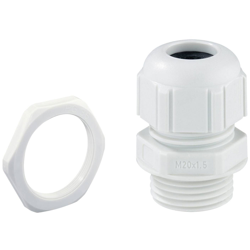 The Spelsberg 22941601 cable gland is a durable plastic component in light grey, designed for shockproof performance. It includes strain relief and a locknut, with a M16 thread size. This product is ideal for securing cables in electrical installations, offering protection and reliability.