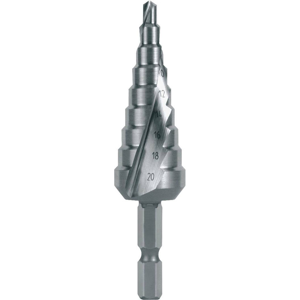 Ruko manufactures the 101051H step drill bit, which features a range of 4 to 20 mm in diameter and a total length of 81 mm. It is designed with a quick-helix construction, ideal for drilling into sheet metal. This high-speed steel tool is commonly used in applications requiring precise, multi-diameter holes.