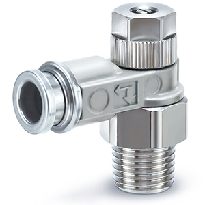 Regulator prędkości SMC Metal z mocowaniem jednoprzyciskowym, przeznaczony do systemów pneumatycznych.