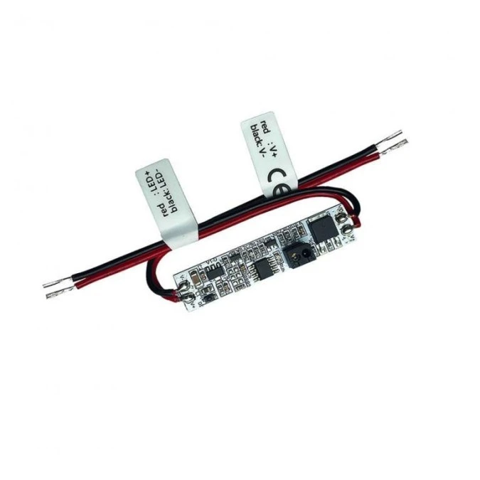Mikro wyłącznik LED - bistabilny to miniaturowe urządzenie przeznaczone do montażu w profilach aluminiowych LED. Wyłącznik do LED E1-B pracuje w trybie bistabilnym, oznacza to załączanie oświetlenia led na stałe w momencie ruchu ręką w zasięgu detekcji sensora. Analogicznie wyłączanie będzie miało miejsce podczas kolejnego ruchu w zakresie sensora IR. Tego typu włącznik do led znajduje zastosowanie w różnego rodzaju oświetleniu kuchennym. Małe rozmiary wyłącznika pozwalają na montaż w profilu aluminiowym przy użycu taśmy dwustronnie klejącej 3M, znajdującej się na tylnej części wyłacznika.
