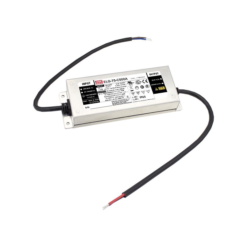 Jednowyjściowy sterownik LED MEANWELL AC-DC z trybem stałego prądu z PFC i 3-przewodowym wejściem i wyjściem 107 VDC przy 0,7 A oraz inteligentnym ściemnianiem czasowym i programowalną funkcją oraz IP67 i wyjściem kablowym.