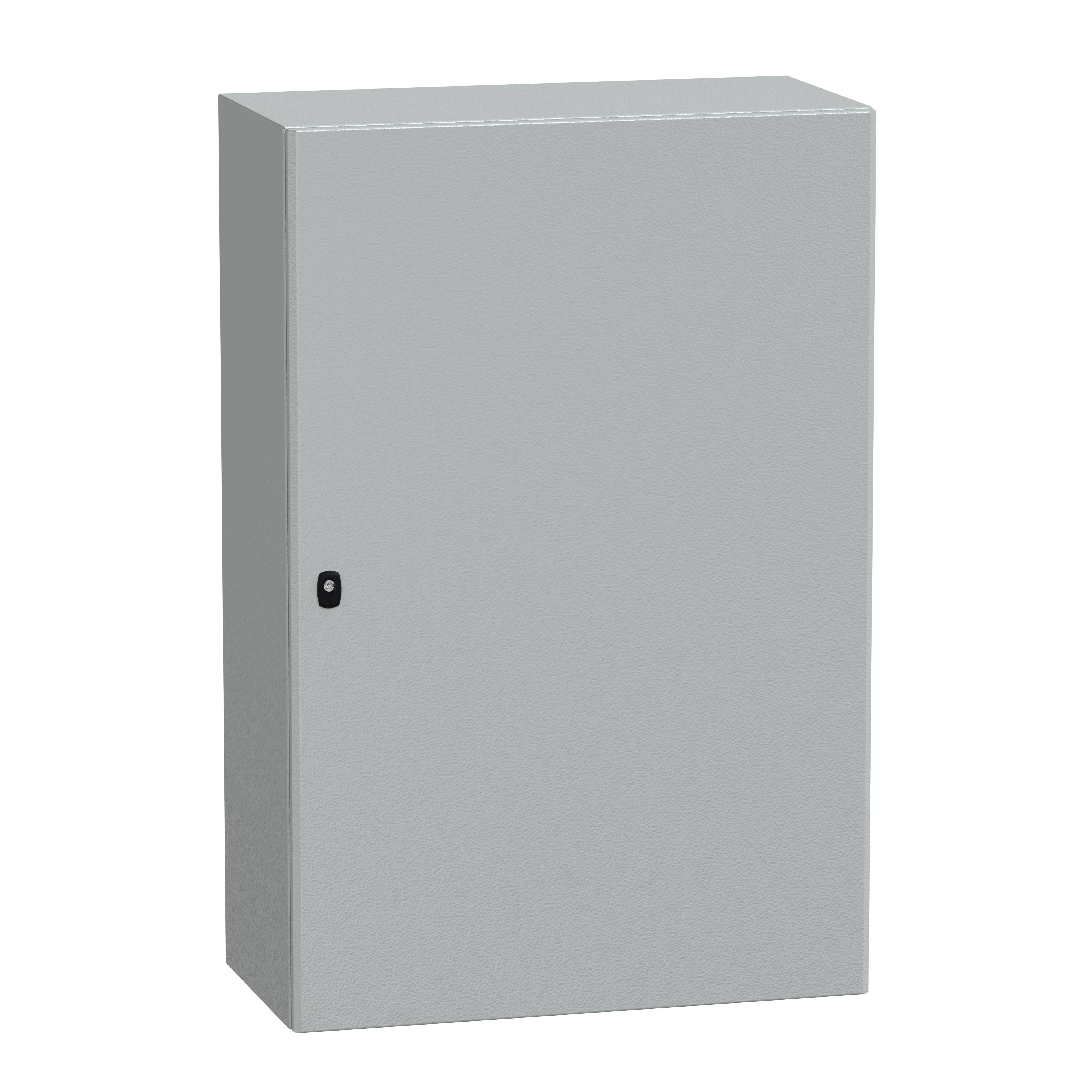 Przestrzenna obudowa ścienna ze stali S3D z pełnymi drzwiami. Obudowa jednoczęściowa, łącznie z płytą montażową. 3-punktowy system ryglowania z klamką i zamkiem dwupiórowym 3 mm. Wykonana ze stali, malowana proszkowo farbą epoksydowo-poliestrową. Stopień ochrony IP 66, IK10, kolor RAL 7035.