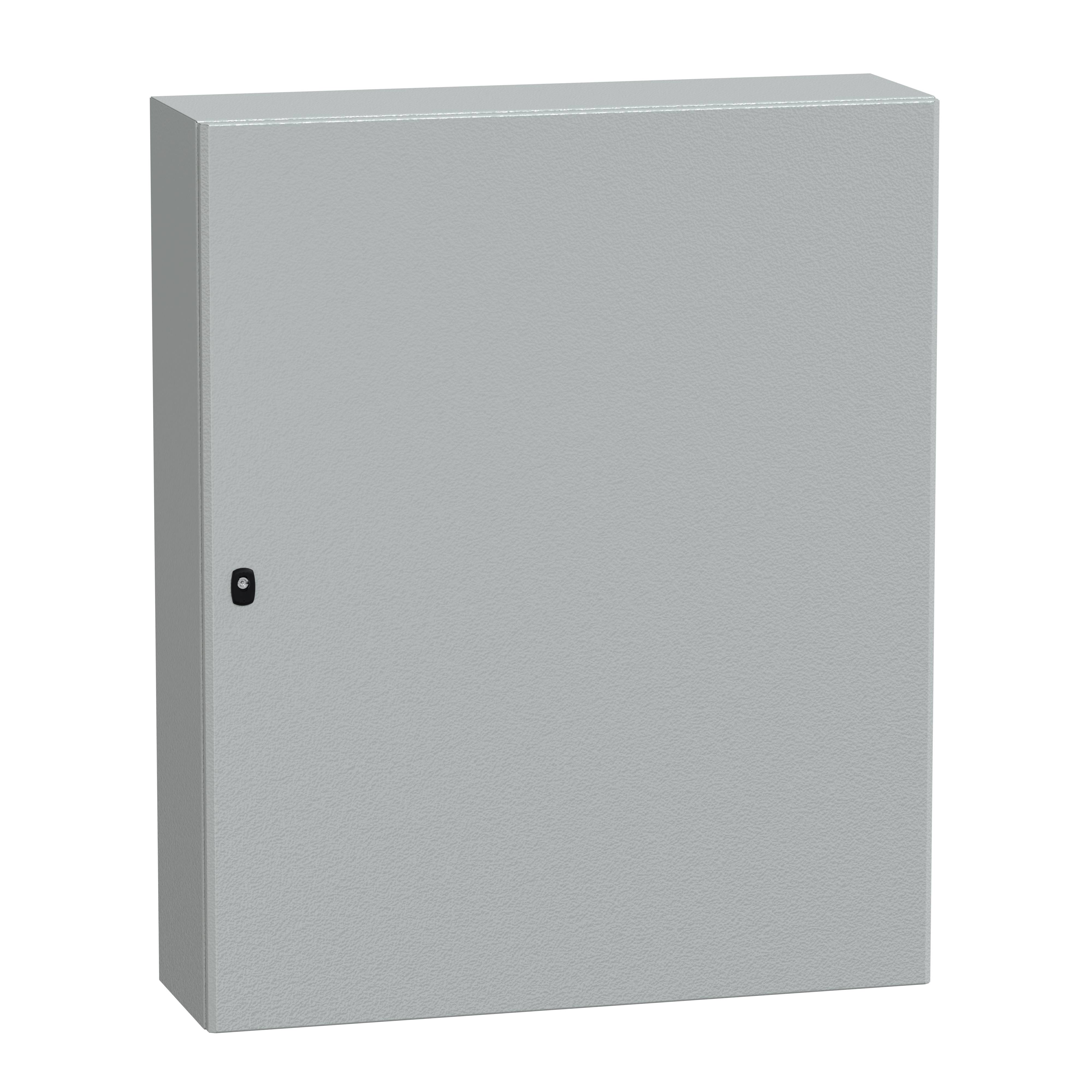 Przestrzenna obudowa ścienna ze stali S3D z gładkimi drzwiami. Obudowa jednoczęściowa, bez płyty montażowej. Solidna konstrukcja oparta na nowej konstrukcji. 3-punktowy system ryglowania z klamką i wkładką zamka z podwójną belką 3 mm. Wykonana ze stali, malowana proszkowo farbą epoksydowo-poliestrową. Szyna czołowa w kształcie koryta, podwójna grubość blachy. Stopień ochrony IP 66, IK10, kolor szary RAL 7035. W standardzie 2 płyty wejściowe kabli. Bogata oferta akcesoriów. Opakowanie po złożeniu nadaje się do ponownego użycia.