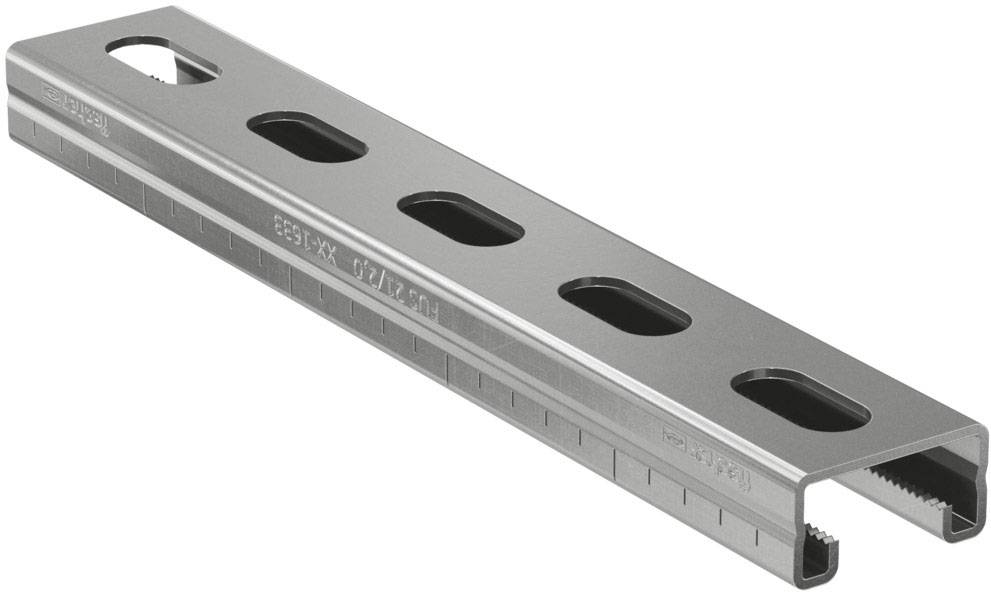 Szyna montażowa fischer FUS jest podstawowym elementem uniwersalnego systemu szynowego FUS do zastosowań średnio-ciężkich. Szyna montażowa składa się z ceownika w 3 wysokościach i 3 podwójnych wysokościach z wyraźnym uzębieniem, co zapewnia bezpieczne trzymanie elementów konstrukcyjnych systemu FUS i umożliwia racjonalne mocowanie ciągów rur i konstrukcji wsporczych. Skalowanie upraszcza przycinanie na długość i umieszczanie elementów łączących. Wersja ocynkowana jest odpowiednia do instalacji wewnętrznych, wersja ocynkowana ogniowo i ze stali nierdzewnej do instalacji na zewnątrz oraz w środowiskach silnie korozyjnych. Certyfikat ochrony przeciwpożarowej zgodnie z MLAR/EN13501 zapewnia dodatkowe bezpieczeństwo.