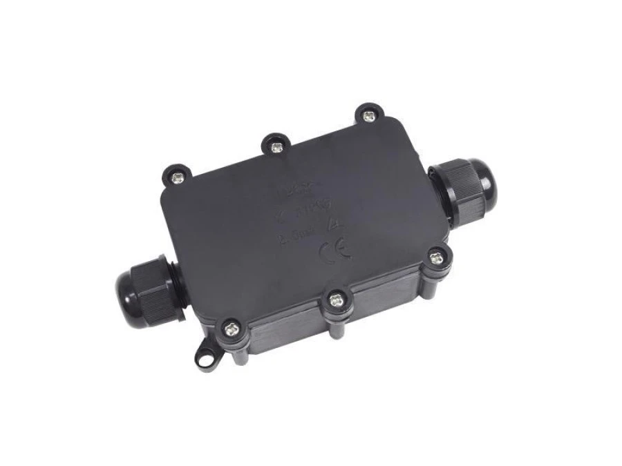 TG-XYPG9-2P puszka 2 wlotowa, hermetyczna IP68 ze złączem 4 toworym. Puszka rozgałęźna posiada klasę wodoszczelności IP68, gwarantującą ochronę przed wilgocią, oraz ochronę przeciwpożarową i pyłoszczelność. Dzięki tym paramterom produkt może być używany zarówno w intensywnym słońcu, jak i podczas deszczowych dni, zarówno na zewnątrz, wewnątrz budynków, jak i pod ziemią Konstrukcja puszki - Puszka jest wyposażona w uchwyty umożliwijające montaż naścienny. Dławice z uszczelkami są dostosowane do kabli o średnicy od 5 do 9 mm, oraz 4 torową kostką elektryczną, co sprawia, że jest odpowiednia dla różnych typów przewodów, jednocześnie zapobiegając przedostawaniu się wody.
