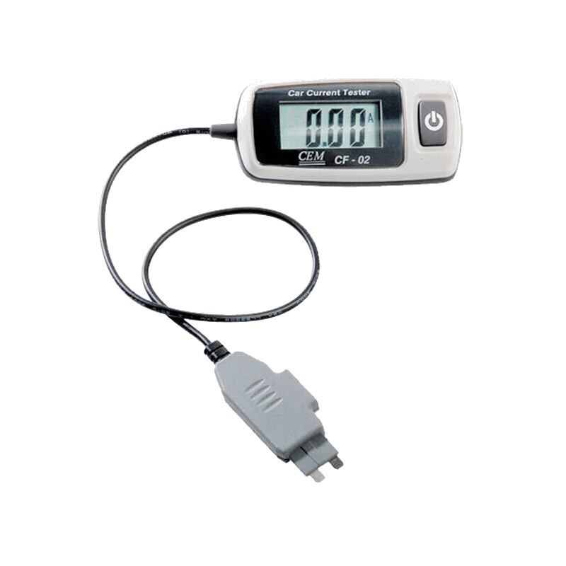 Miernik samochodowy prądu CEM CF-02 Maksymalny prąd pomiarowy 20A Maksymalne napięcie wejściowe DC 48V Dokładność ±2% + 2 cyfry Długość przewodu pomiarowego ok. 75cm Rozdzielczość 10mA OBSŁUGA 1.Umieść bezpiecznik nożowy w gnieździe adaptora pomiarowego. 2.Podłącz końcówkę adaptora w miejsce bezpiecznika. 3.Przyciśnij i przytrzymaj włącznik obok wyświetlacza. 4.Włącz zasilanie w instalacji samochodowej i odczytaj prąd na wyświetlaczu LCD