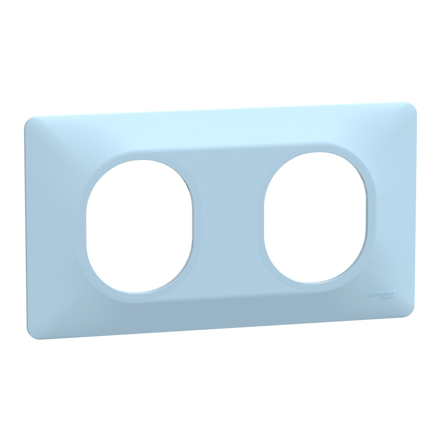 Płytka wykończeniowa Schneider Electric 2-gang z serii Ovalis, dostosowana do instalacji poziomych o rozstawie między środkami 71 mm.
