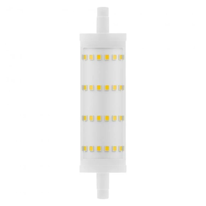 Żarówka LED R7s 118mm 13W = 100W 1521lm 2700K Ciepła 330° OSRAM STAR Żarówka Żarnik STAR R7s to ekologiczny żarnik LED znanej i renomowanej marki OSRAM , który jest idealnym zamiennikiem obecnie stosowanych żarników halogenowych zasilanych napięciem 230V o długości 118mm . Bez trudu można zamontować go w istniejących Oprawach. Do wyprodukowania tego żarnika LED R7S został użyty wysokiej jakości układ elektroniczny oraz została zastosowana energooszczędna technologia diodowa. Żarnik ten ma kształt walca z diodami umieszczonymi dookolnie, dzięki temu wykorzystuje odbłyśnik zamontowany w oprawie dając przez to więcej światła. Produkt charakteryzuje się bardzo niskim zużyciem energii, oszczędność nawet do 90% - Dzięki wymianie tradycyjnych żarników halogenowych na żarniki LED można uzyskać natychmiastową znaczną oszczędność energii, a jednocześnie przyczynić się do ochrony środowiska. Cechy produktu: LED zamiennik żarówek z trzonkiem R7s. Dobra jakość światła, wskaźnik oddawania barw Ra: ≥ 80 . Korzyści ze stosowania produktu: Dopasowane do większości opraw oświetleniowych R7 dzięki mimośrodowemu typowi trzonka. Równomierny rozsył światła we wszystkich kierunkach. Niskie obciążenie cieplne. Obszar zastosowań: Zastosowania domowe. Oświetlenie ogólne w miejscach o temperaturach otoczenia od -20 do +40 °C. Doskonałe rozwiązanie do instalacji dekoracyjnych. Produkt wykonany został z wysokiej jakości materiałów, zapewniających jego długotrwałą żywotność i satysfakcję z zakupu. Kupując u nas, otrzymujesz nowy, oryginalnie zapakowany produkt. Tylko zakup markowych produktów gwarantuje wysoką jakość, energooszczędność, bezpieczeństwo użytkowania oraz pewność, że informacje umieszczone na opakowaniach będą zgodne z prawdą.