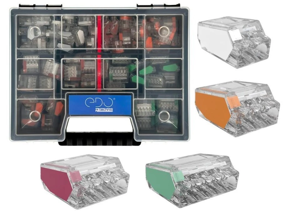 Komplet szybkozłączek do przewodów sztywnych to praktyczny zestaw zapakowany w poręczną walizkę, ułatwiający organizację pracy elektryka. Zawiera różne typy złączek, które pozwalają na szybkie i pewne łączenie przewodów w instalacjach elektrycznych. Idealnie sprawdzi się zarówno podczas montażu, jak i w serwisie czy pracach modernizacyjnych.