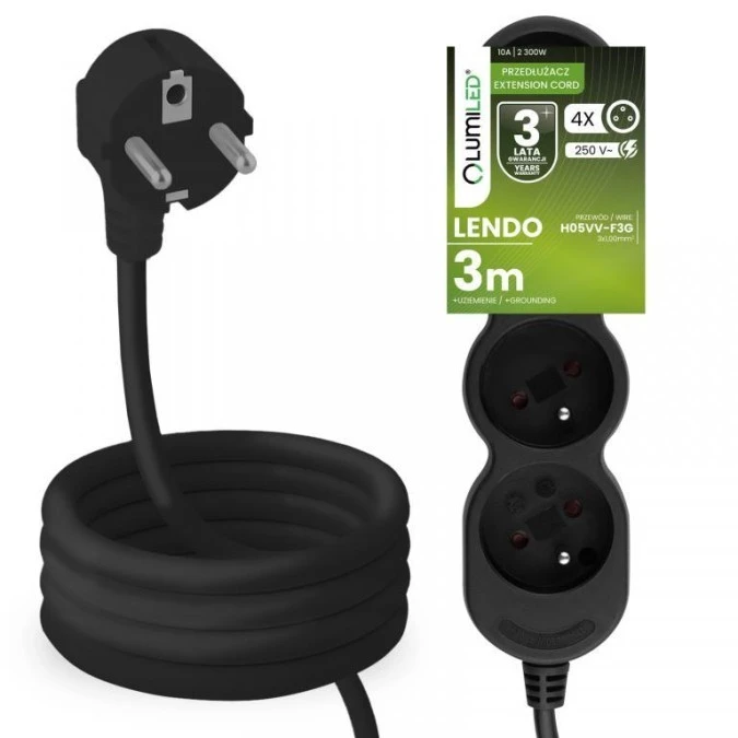 Przedłużacz Sieciowy Kabel z Uziemieniem Listwa Zasilająca 4 Gniazda 3m Czarny Sznur Lendo Lumiled