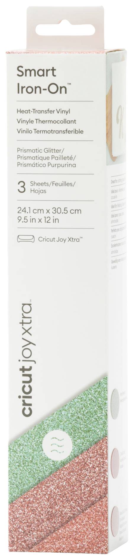 Wreszcie: brokat, który nie wprawia w poczucie winy. Cricut Joy Xtra Smart Iron-On™ z pryzmatycznym brokatem to mikroplastyczny, pozbawiony płatków materiał brokatowy, który dodaje kolorowego wymiaru Twoim projektom termotransferowym. Co więcej, nie jest wymagana żadna mata do cięcia — wystarczy ją załadować i gotowe. Dodaj fascynującego blasku swoim imprezowym strojom lub dekoracjom: po prostu wytnij swoje indywidualne projekty za pomocą maszyny Cricut i przenieś je na wybraną powierzchnię. Użyj Cricut EasyPress™, aby ułatwić transfer.