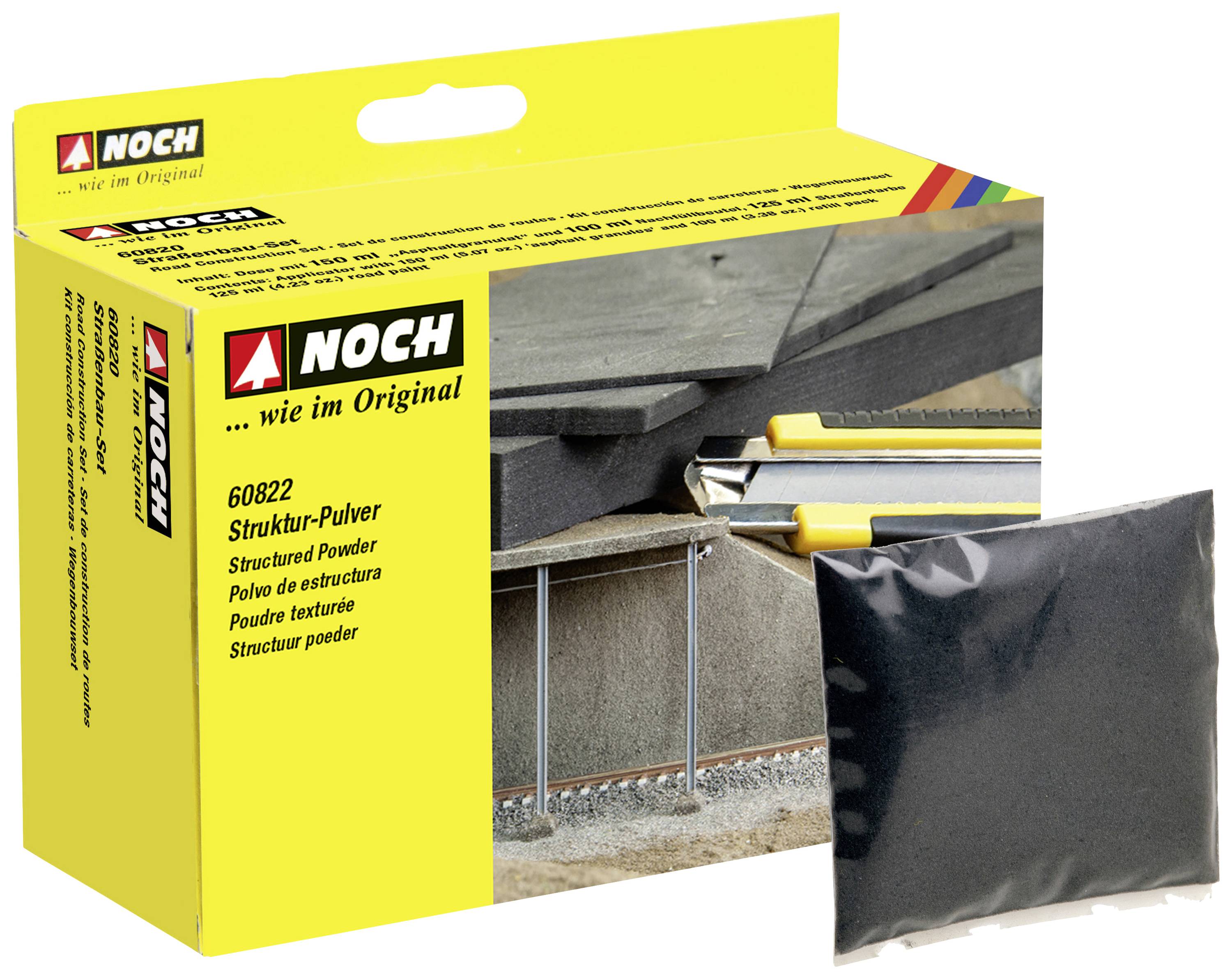 Proszek strukturalny NOCH jest wyjątkowo drobny, dzięki czemu struktury można nakładać na ulice, place, ściany i inne elementy. W tym celu proszek równomiernie rozsypuje się na jeszcze mokry klej do trawy za pomocą puszki zraszacza. Po wyschnięciu kleju do trawy powierzchnia jest m.in. B. pomalować farbą do konstrukcji drogowych NOCH lub farbą akrylową NOCH i uszczelnić nią powierzchnię.