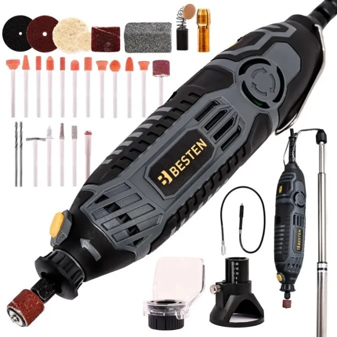 Mini szlifierka 200 W BESTEN Statyw regulowany + haczyk do zawieszenia Wałek giętki Prowadnica Osłona głowicy 200 akcesoriów (frezy, tarcze, szczotki, papiery, wiertła, krążki) Walizka organizer Instrukcja obsługi w języku polskim Oryginalne opakowanie producenta
