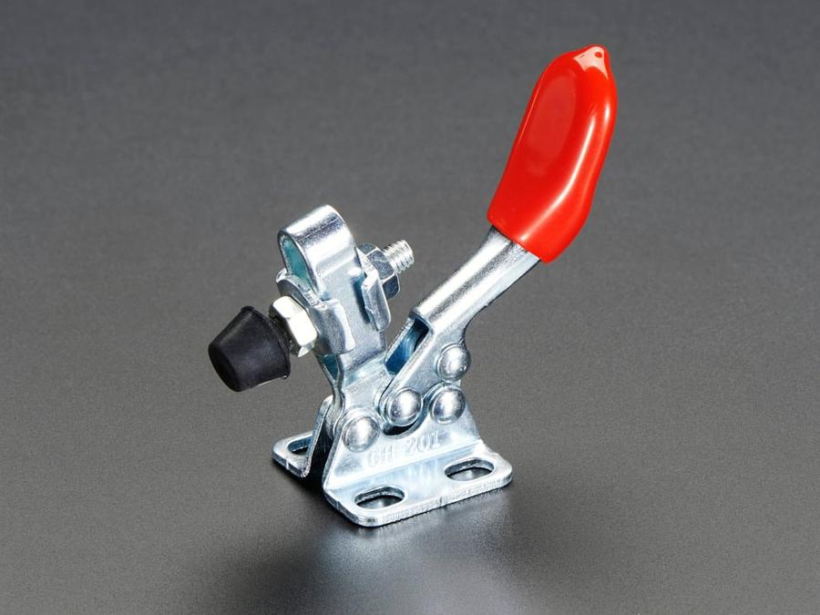 Pin down that PCB with our Toggle Clamp, a sturdy and reliable way to quickly press and release with precision! A pogo-pin bed is a great way to connect and test boards without any soldering, but you have to somehow get that PCB aligned right and evenly pressed down on each pogo. After much experimenting, we settled on this toggle clamp and we use it all the time in our testing processes.This beauty is strong enough to grip onto a PCB, but the rounded rubber tip ensures it won't mar or damage any circuits. You'll need to bolt it securely, then attach the rubber nub with the included hex nuts. The height of the nub can be adjusted, as can the location along the clamp.This is the small-size flip-down type toggle clamp.
