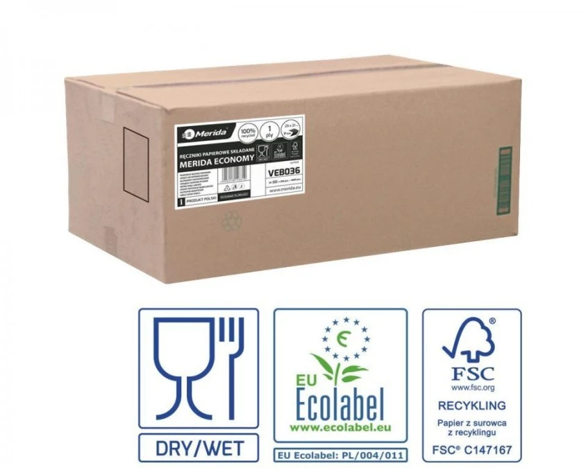MERIDA Economy VEB036 to jednowarstwowe ręczniki papierowe w kolorze białym, przeznaczone do użytku w łazienkach i strefach higienicznych o średnim i dużym natężeniu ruchu. Składane listkowo, zapewniają wygodne, higieniczne i ekonomiczne osuszanie rąk.