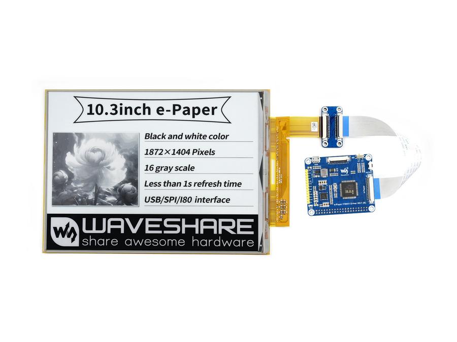 Experience seamless visual integration with the 1872×1404, 10.3-inch flexible E-Ink display HAT for Raspberry Pi, ensuring exceptional clarity with every glance.Featuring IT8951 controller technology, it guarantees smooth operation and rapid refresh rates, perfect for continuous data display or interactive digital content.With versatile connectivity through USB, SPI, and I80 interfaces, flexibility is at your fingertips. Easily connect to your Raspberry Pi for dynamic applications like digital signage or e-books.Enjoy low power consumption, making it ideal for portable projects and preserving battery life during extended use. The flexible construction also adapts to various prototypes and design formats.