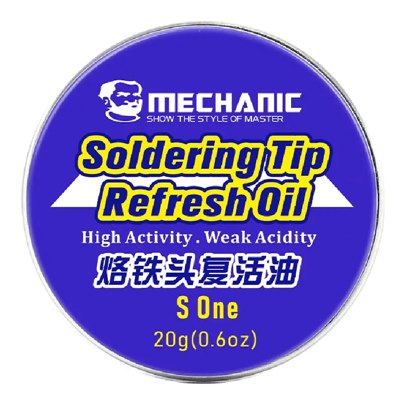 Profesjonalny preparat do regeneracji grotów lutowniczych Mechanic S One – Soldering Tip Refresh Oil, 20 g (puszka) Profesjonalny preparat do regeneracji grotów lutowniczych Mechanic S One to wysokiej jakości olejek/masa regenerująca grot (tzw. Soldering Tip Refresh Oil), przeznaczona do szybkiego odnawiania powierzchni grotu w lutownicach elektrycznych. Produkt usuwa warstwę tlenków, przywraca idealne zwilżanie grotu cyną i znacząco wydłuża jego żywotność. Najważniejsze cechy produktu