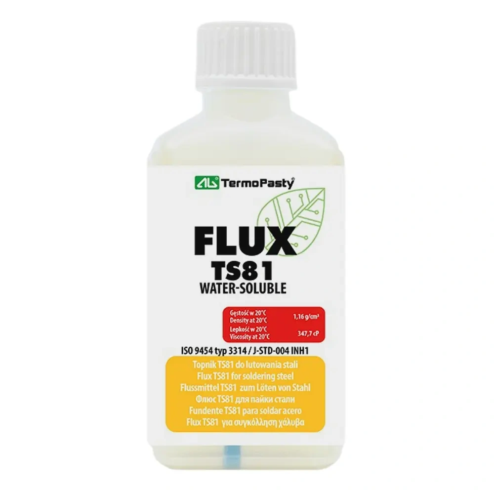 Topnik TS81 do lutowania stali i stopów chromowo-niklowych Topnik TS81 ART.AGT-323 - produkt stworzony z myślą o najbardziej wymagających aplikacjach. Niezależnie od tego, czy jesteś profesjonalistą zajmującym się precyzyjnym lutowaniem metalowych komponentów, czy pasjonatem, który szuka niezawodnego rozwiązania. Topnik TS81 to gwarancja solidnych i trwałych połączeń lutowniczych. Dzięki niemu możesz mieć pewność, że Twoje projekty będą nie tylko precyzyjne, ale również bezpieczne i trwałe. Cechy produktu: Lutowanie trudnych materiałów: Topnik TS81 został zaprojektowany z myślą o lutowaniu elementów z różnego rodzaju stali, w tym kwasoodpornej, oraz stopów chromowo-niklowych. Jego unikalna formuła zapewnia doskonałą zwilżalność i przyczepność, minimalizując ryzyko powstawania wad lutowniczych. To sprawia, że jest idealnym wyborem dla tych, którzy potrzebują produktu o najwyższej wydajności i niezawodności w wymagających zastosowaniach. Wysoko aktywny i wszechstronny: Topnik TS81 to wysoko aktywny topnik (ISO 9454 typ 3314 / J-STD-004 INH1), który zapewnia skuteczne i trwałe połączenia lutownicze nawet w przypadku najtrudniejszych do lutowania materiałów. Jego wszechstronność sprawia, że doskonale sprawdza się zarówno w profesjonalnych warsztatach, jak i przy mniejszych, domowych projektach. Wyjątkowe właściwości fizykochemiczne: Topnik TS81 łączy w sobie wysoką efektywność lutowania z komfortem użytkowania. Jego lepka konsystencja (347,7 cP) pomaga kontrolować ilość naniesionego topnika. Gęstość wynosząca 1,16 g/cm³ oraz pH na poziomie 1,2 (1% roztwór wodny) świadczą o jego wysokiej aktywności chemicznej. Water-soluble: Po zakończeniu pracy wystarczy opłukać miejsce lutowania w ciepłej (ok. 50 °C), dejonizowanej wodzie, używając przy tym miękkiej antystatycznej szczoteczki do usunięcia osadów. Następnie spłukujemy miejsce mycia zimną wodą, aby usunąć pozostałości, a także zapobiec osadzaniu się resztek. Aby uzyskać lepszy efekt, użyj Zmywacza PCB wodnego, skuteczniejszego niż zwykła woda dejonizowana - zapobiega korozji oraz zanieczyszczeniom na lutowanych elementach. Zastosowanie: