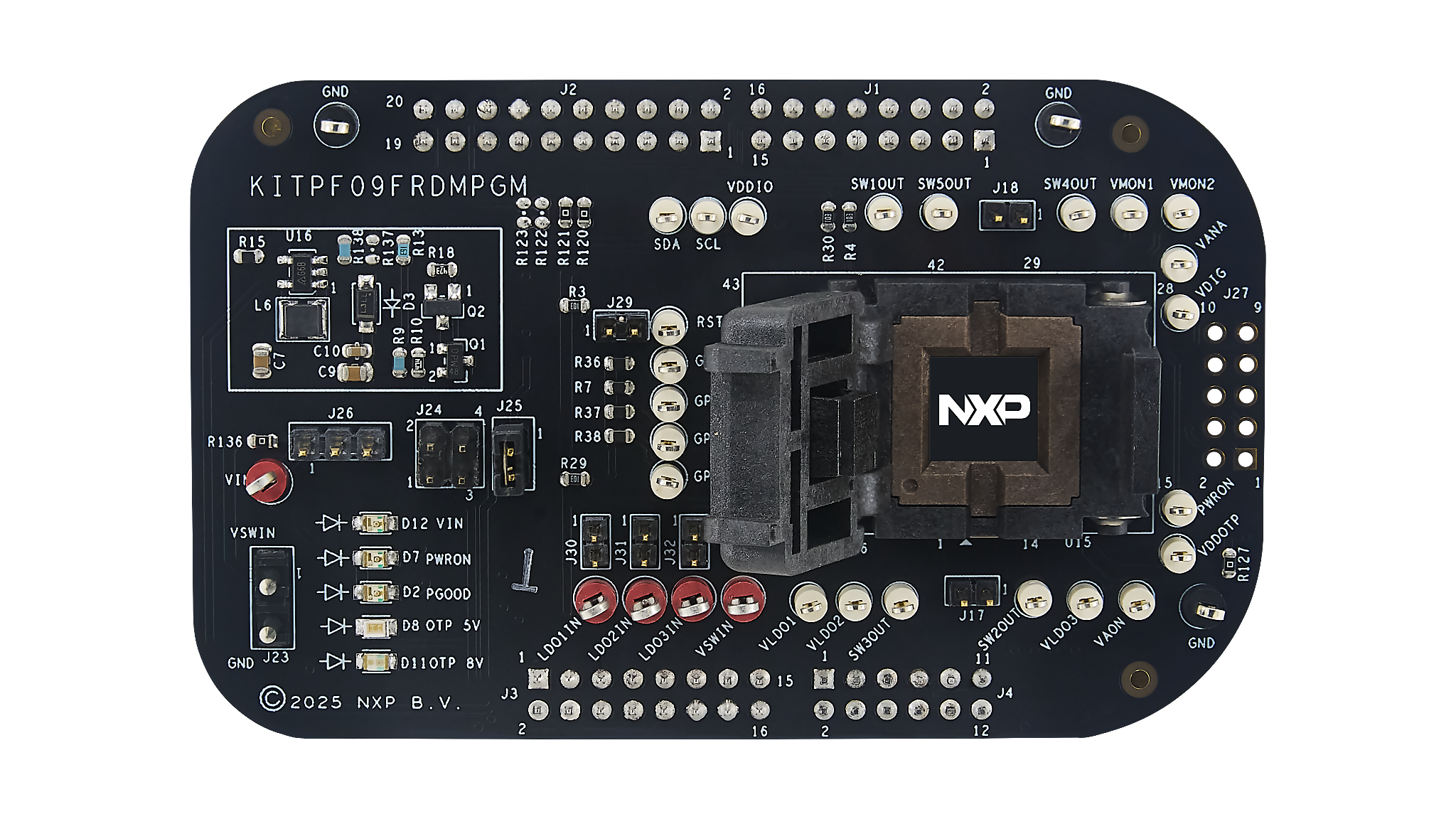 The KITPF09FRDMPGM is a customer programing board featuring the PF09, a Nine-channel power management IC with
